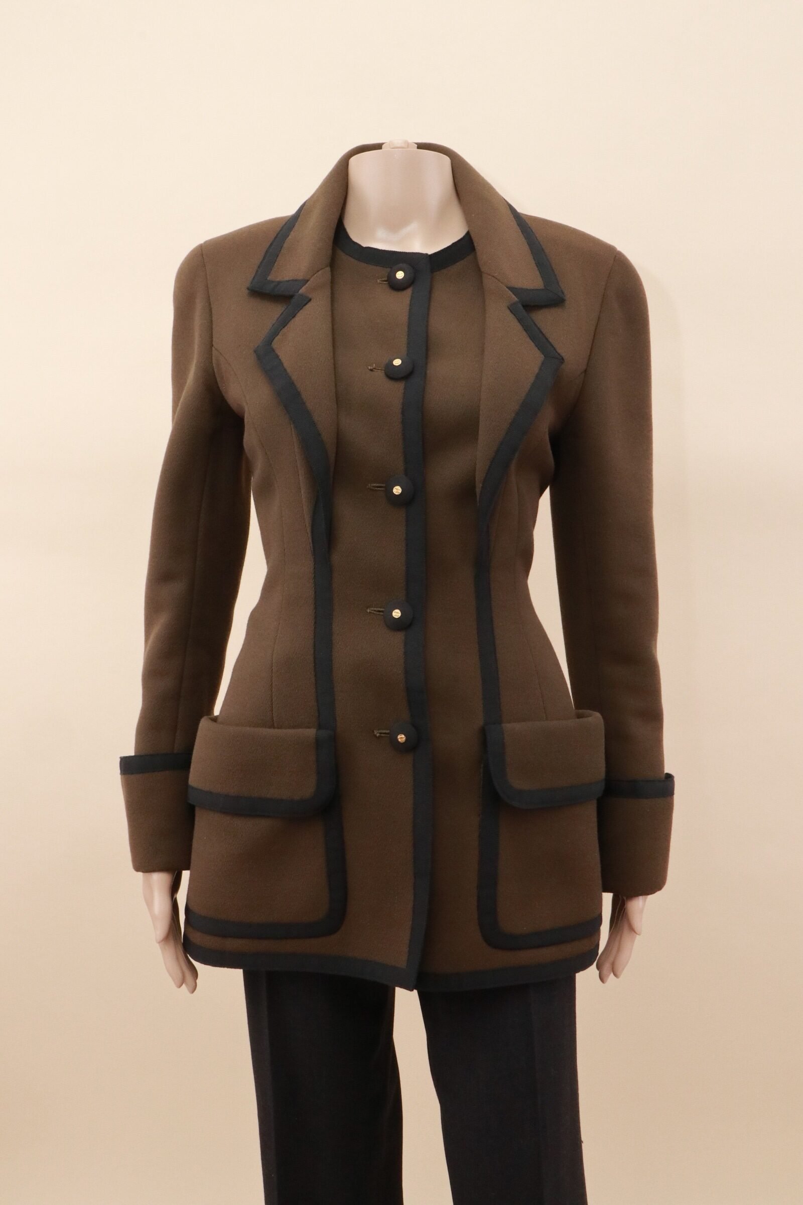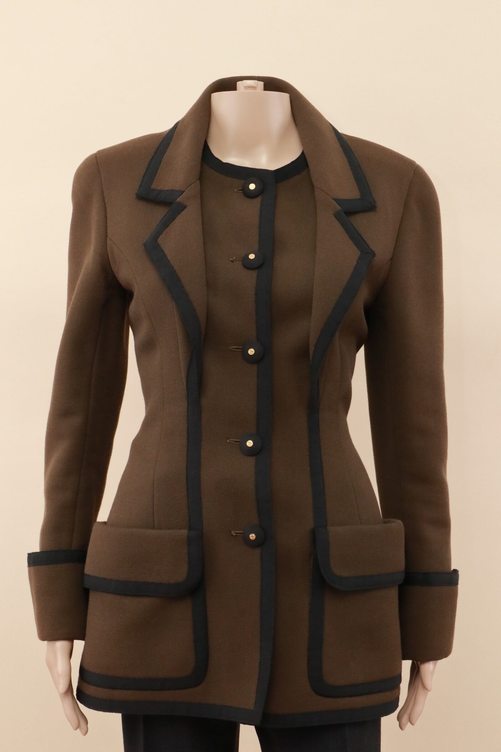 A rare and exquisitely constructed vintage Chanel Boutique jacket, crafted in France and designed with the house’s unmistakable couture-inspired elegance. This tailored piece features a rich khaki wool body framed by deep navy grosgrain trim — a striking contrast that highlights the garment’s sculpted lines and impeccable structure.