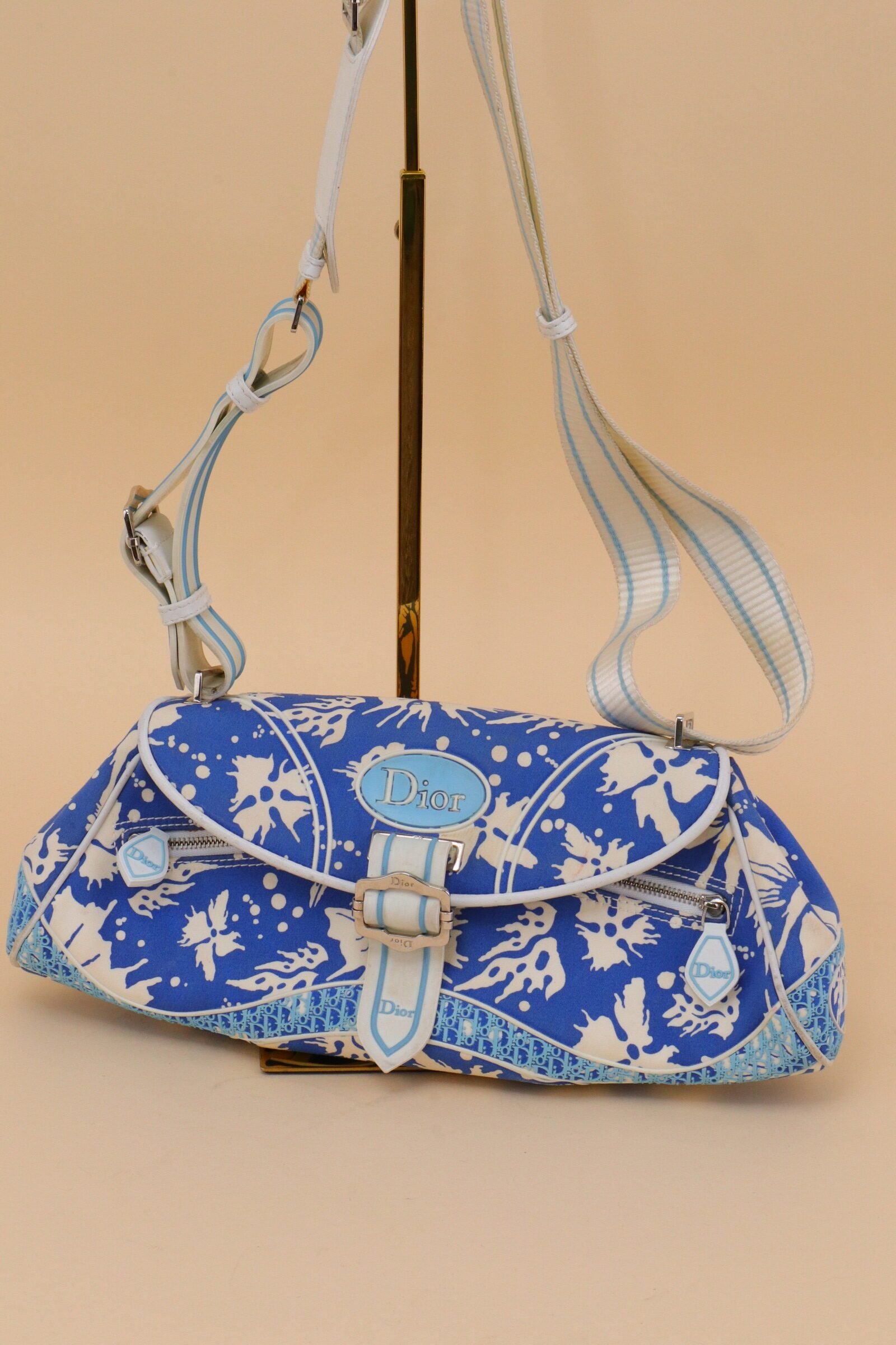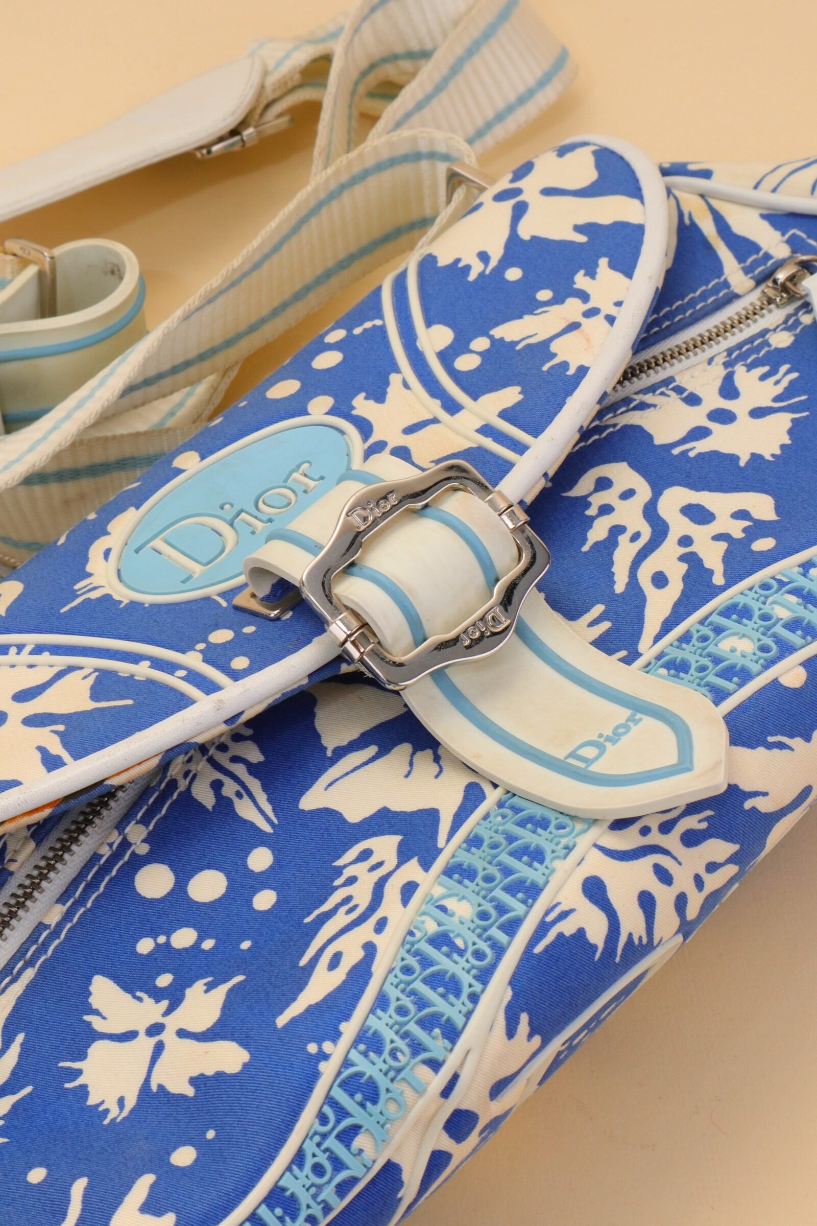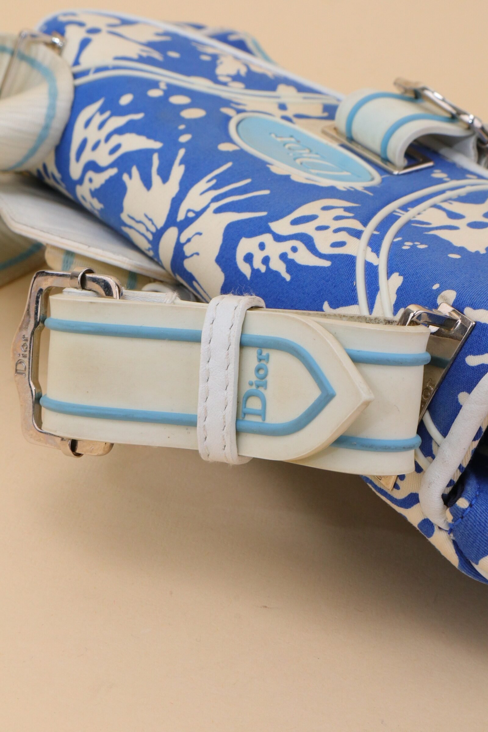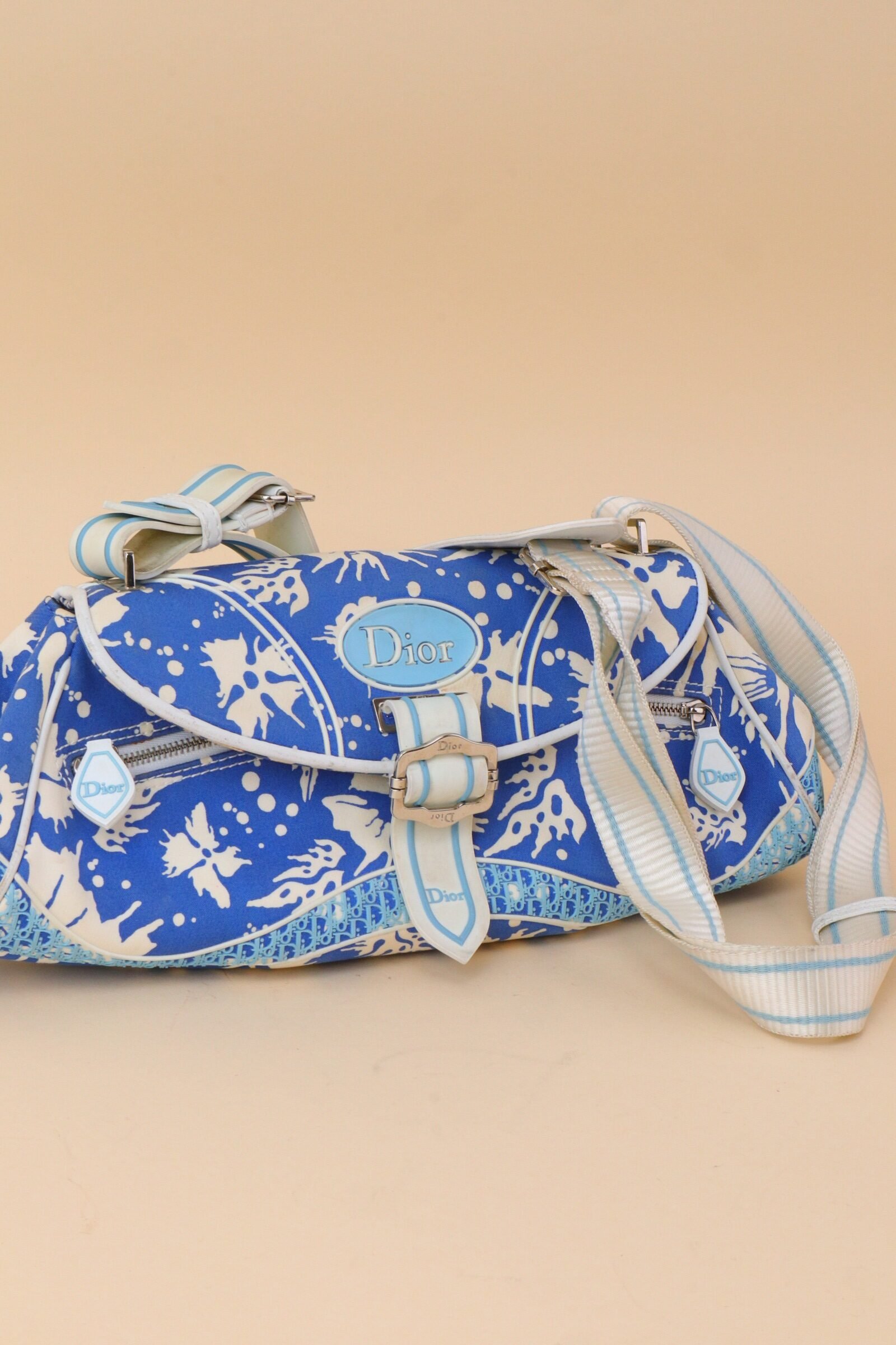 Crafted in coated canvas, the bag features a striking blue and white abstract print accented by soft blue Dior logo hardware and white leather trim. The curved flap silhouette is enhanced by a central buckle detail, adding structure while maintaining a relaxed, beach-inspired aesthetic. From 2004 Collection by John Galliano.