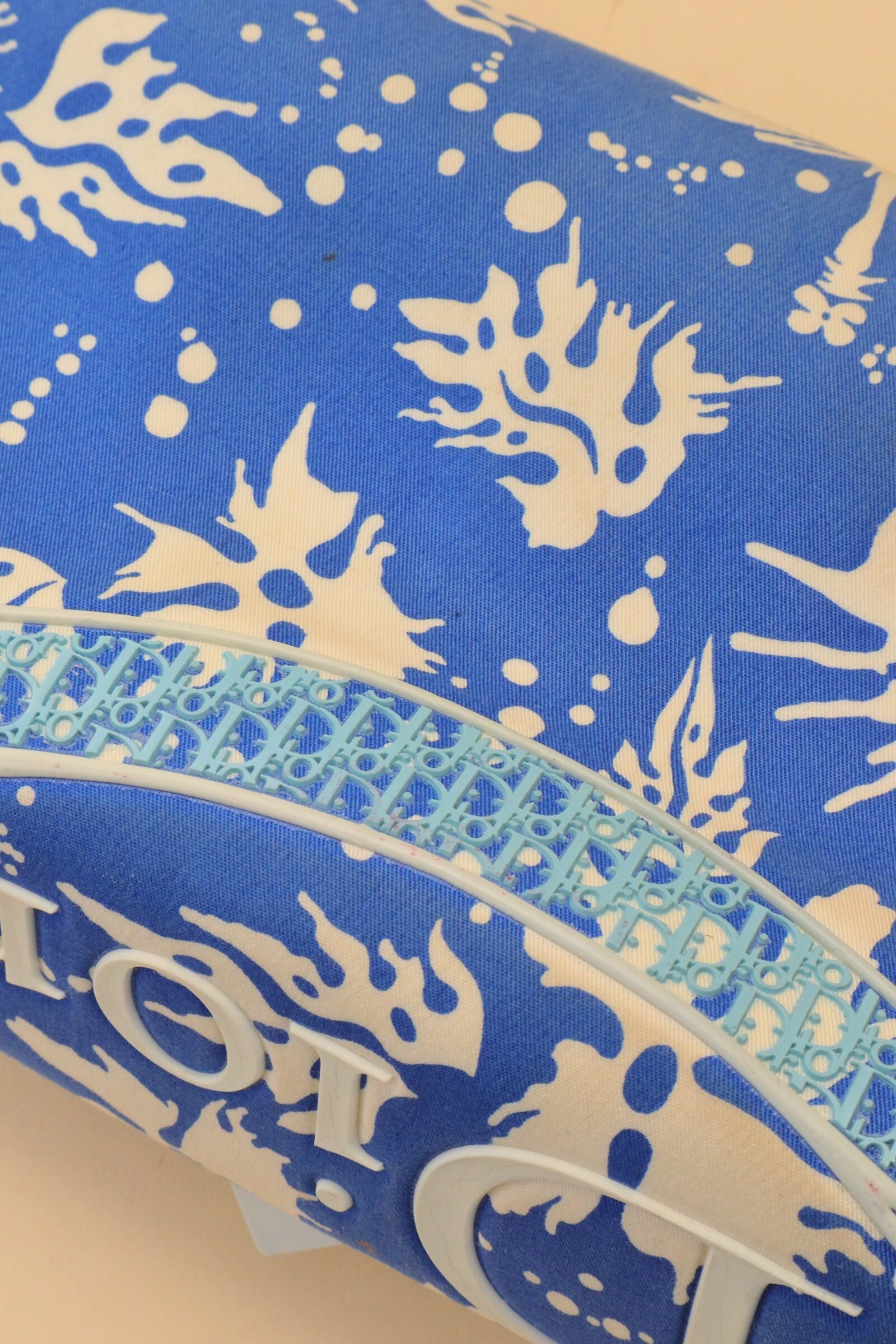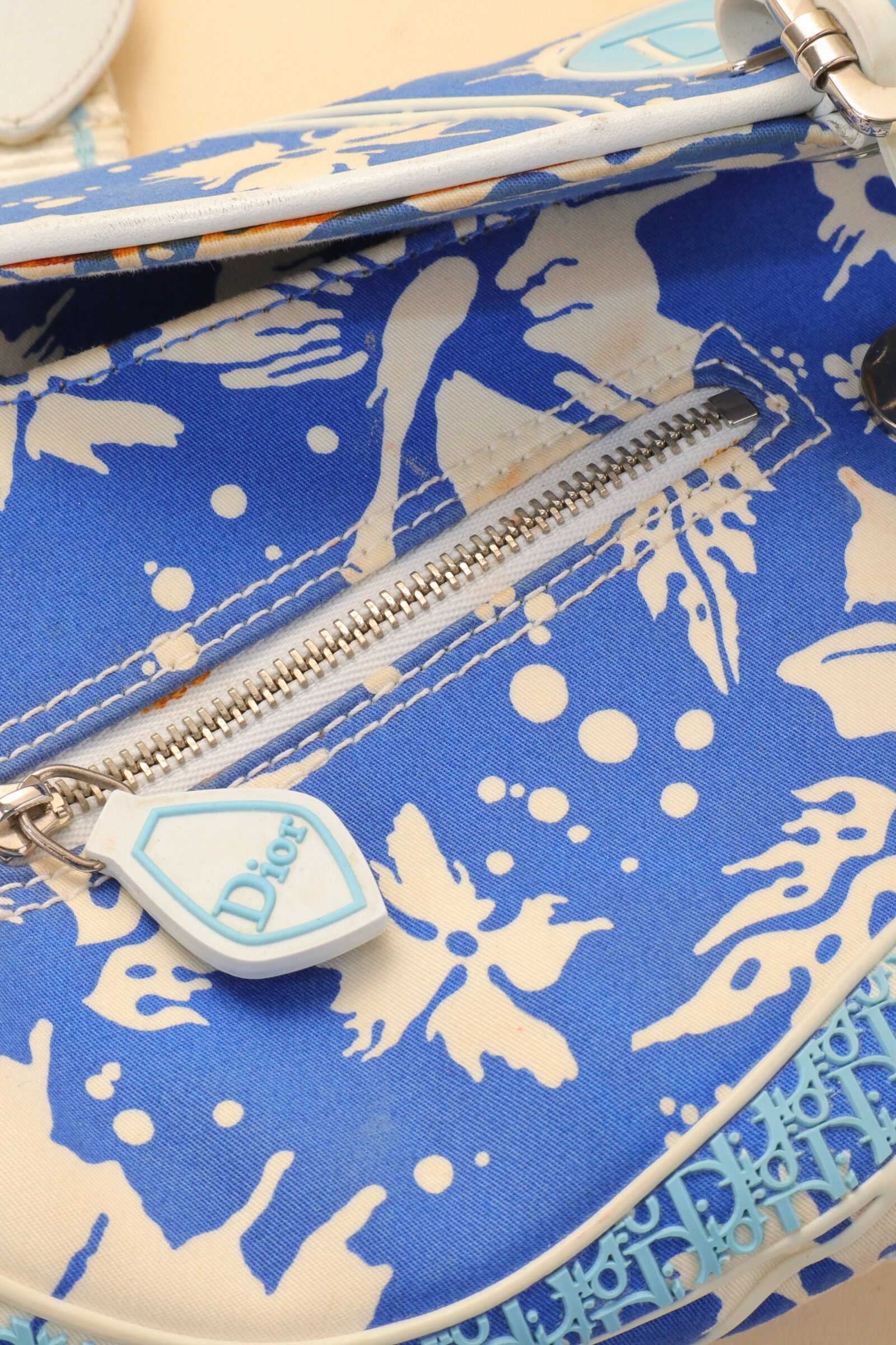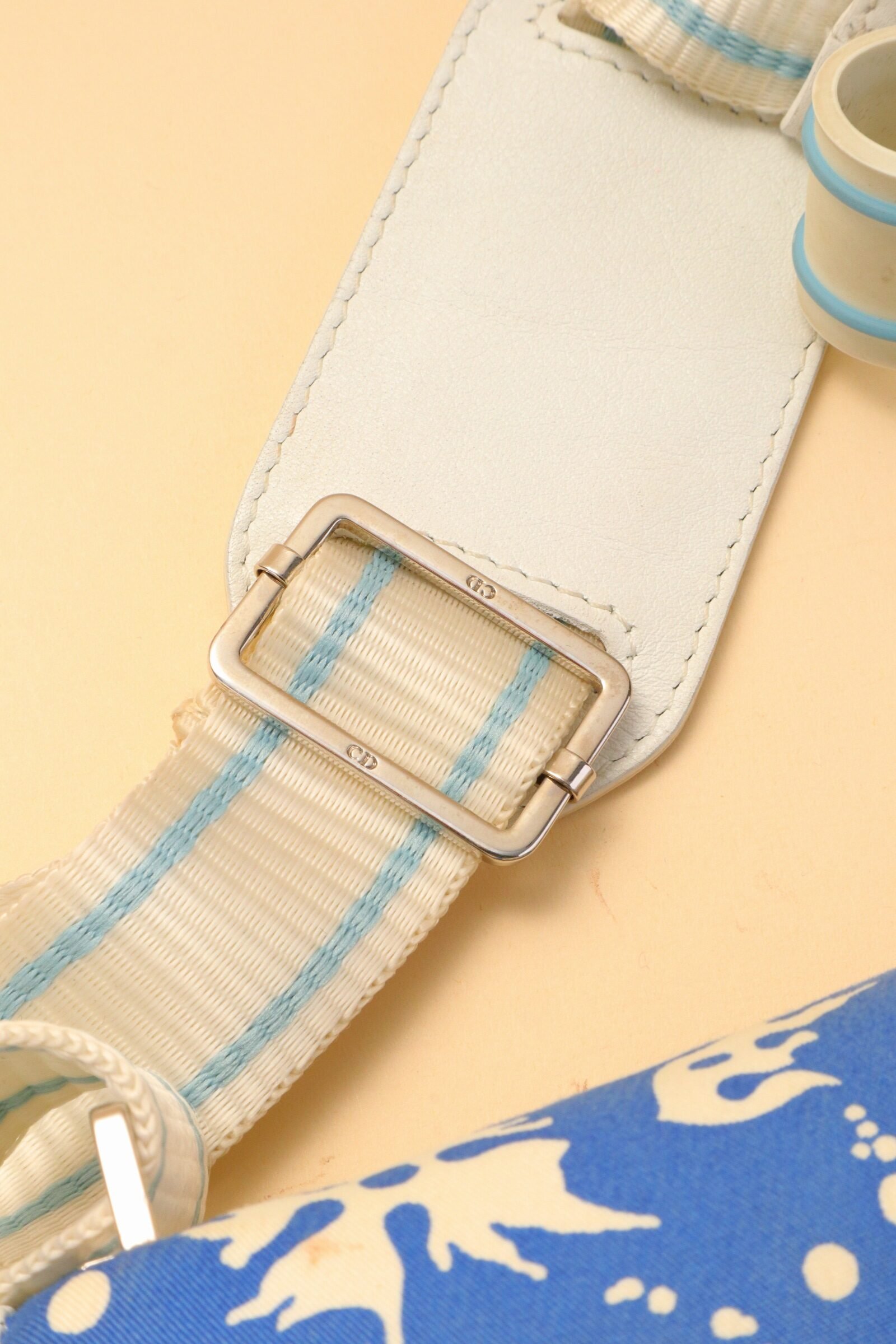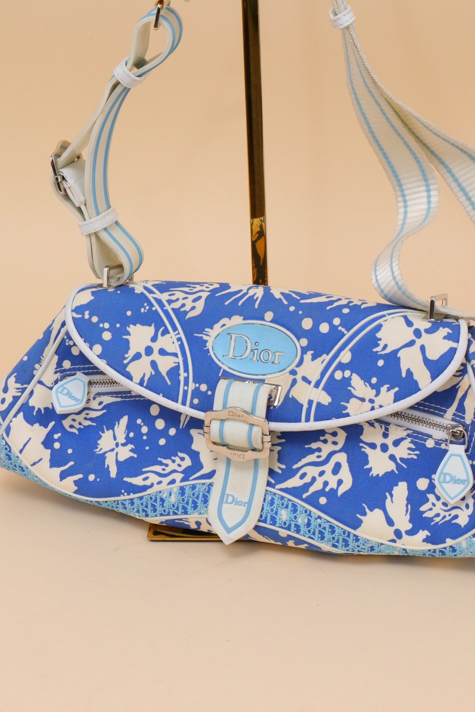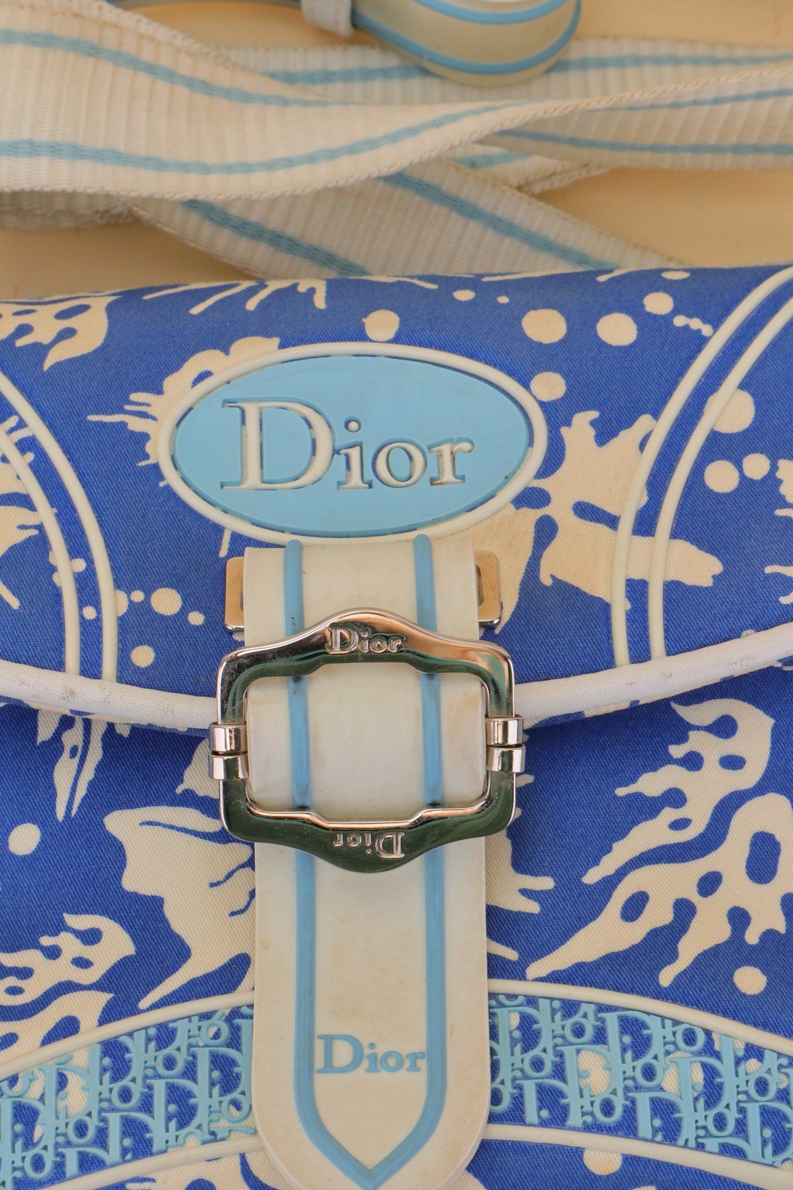 Crafted in coated canvas, the bag features a striking blue and white abstract print accented by soft blue Dior logo hardware and white leather trim. The curved flap silhouette is enhanced by a central buckle detail, adding structure while maintaining a relaxed, beach-inspired aesthetic. From 2004 Collection by John Galliano.
