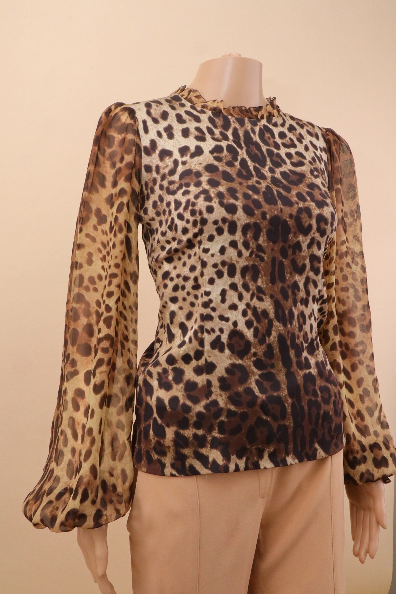 Designed with a softly structured silhouette, the blouse features a classic leopard motif in warm, earthy tones that instantly elevates any look. The delicate ruffled neckline adds a subtle romantic edge, while the sheer, flowing sleeves create movement and contrast against the more structured body. A piece that feels both powerful and graceful—true to the essence of Dolce & Gabbana.