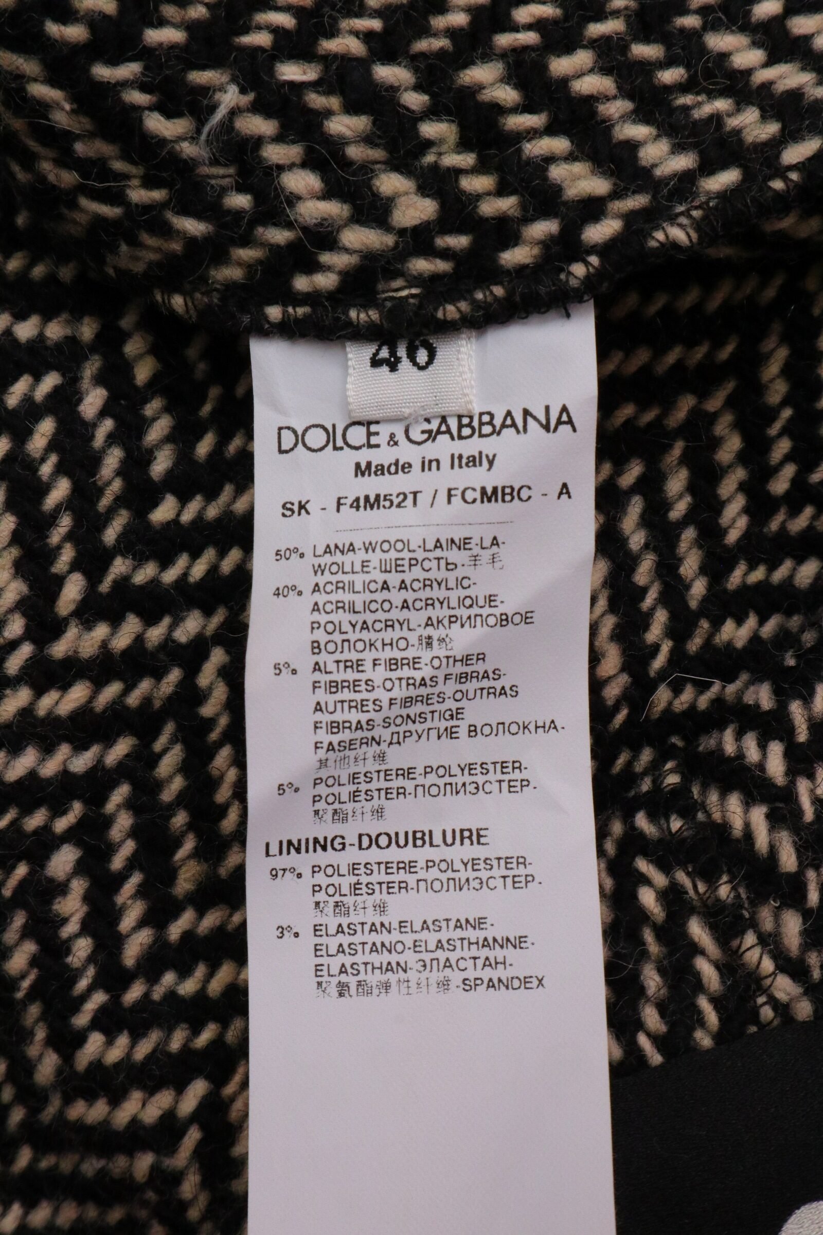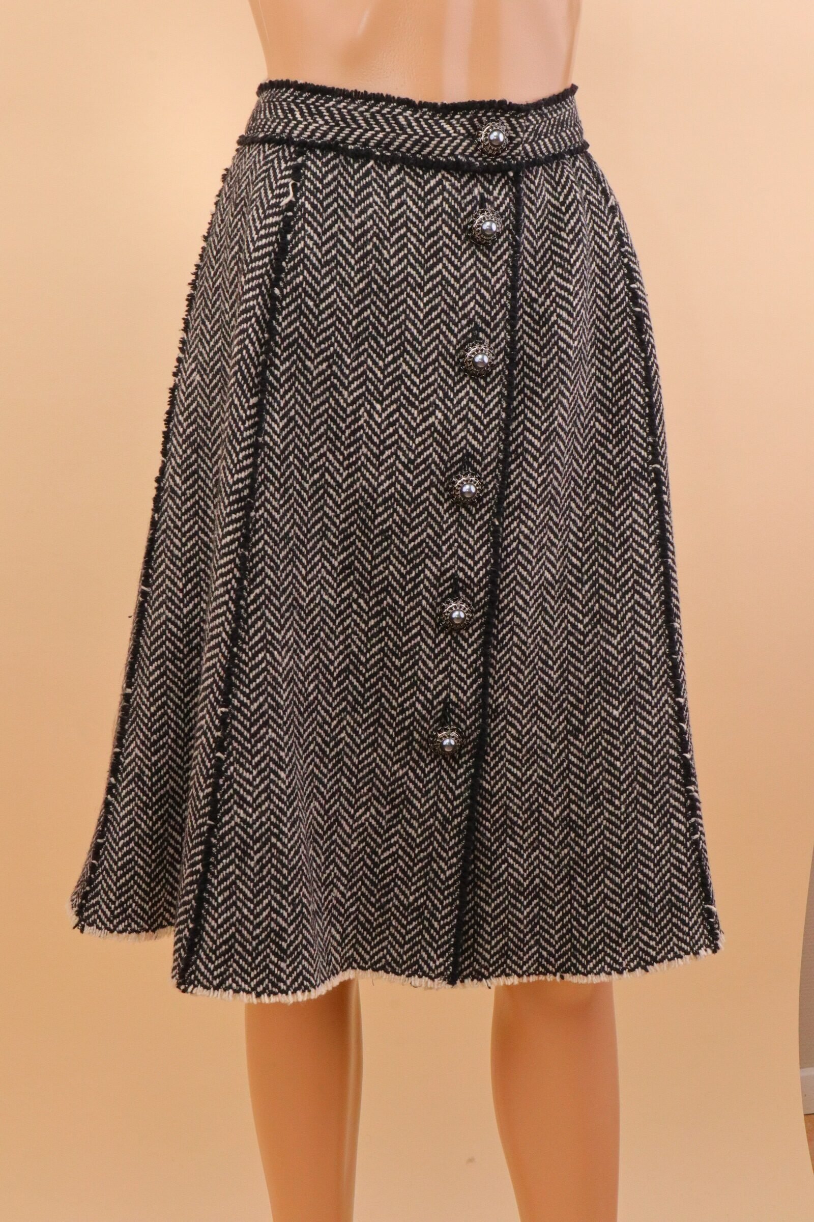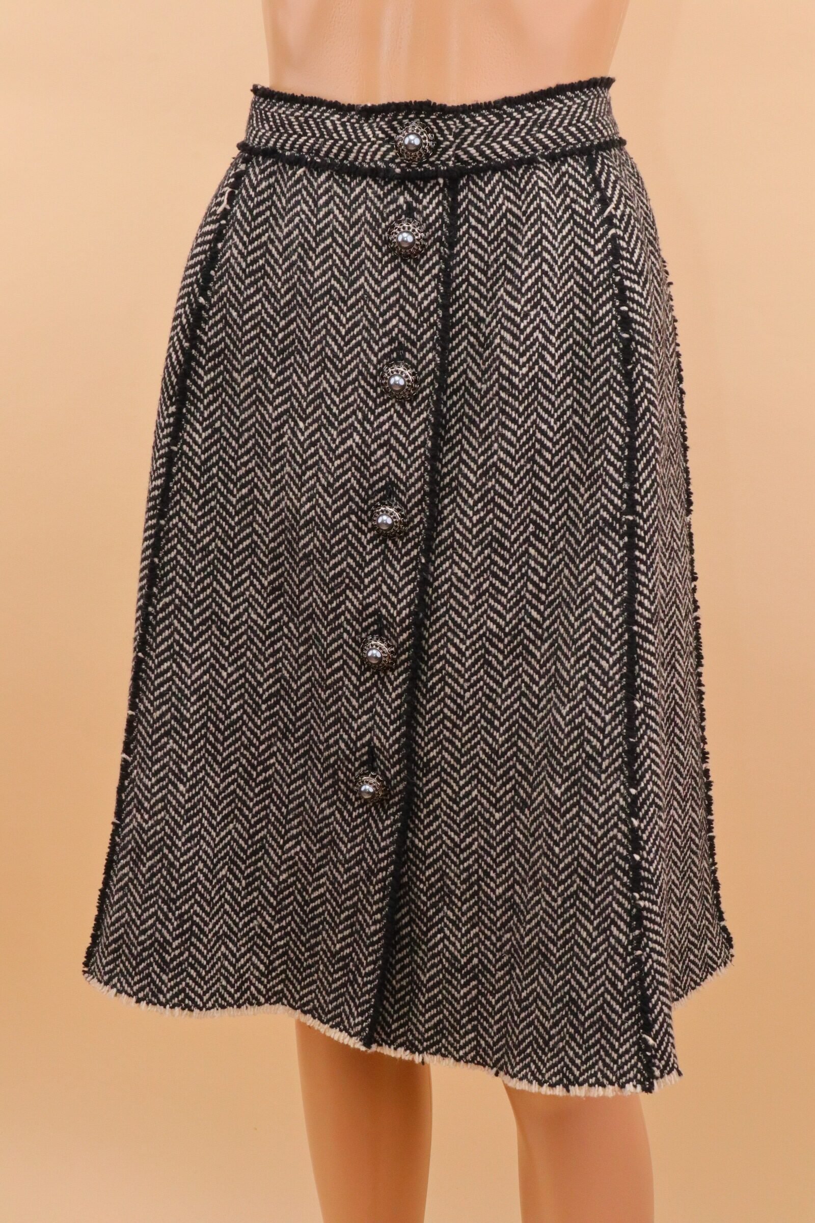 An elegant expression of Dolce & Gabbana tailoring, this tweed skirt combines classic heritage fabric with distinctive couture-inspired detailing. Crafted in a structured black-and-cream herringbone tweed, the design features a softly flared silhouette enhanced by ornate pearl-style buttons framed with intricate metal settings — a subtle nod to vintage Italian glamour.