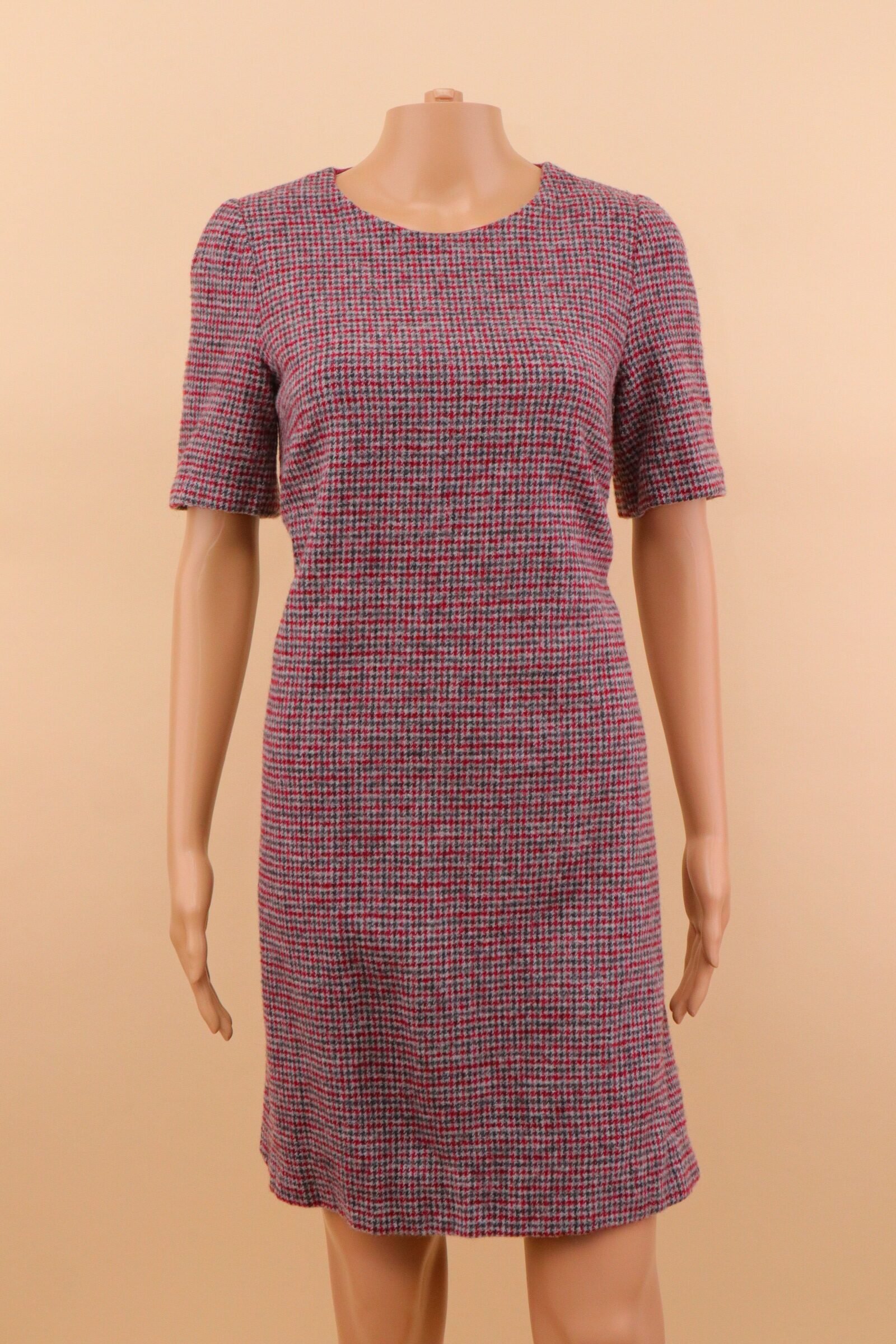 Rendered in a subtle micro-check pattern with soft red and grey tones, the dress embodies understated sophistication — easy to style for both daytime refinement and elevated evening wear. The minimal neckline and short sleeves allow the fabric and tailoring to take center stage, making this piece a versatile wardrobe investment.