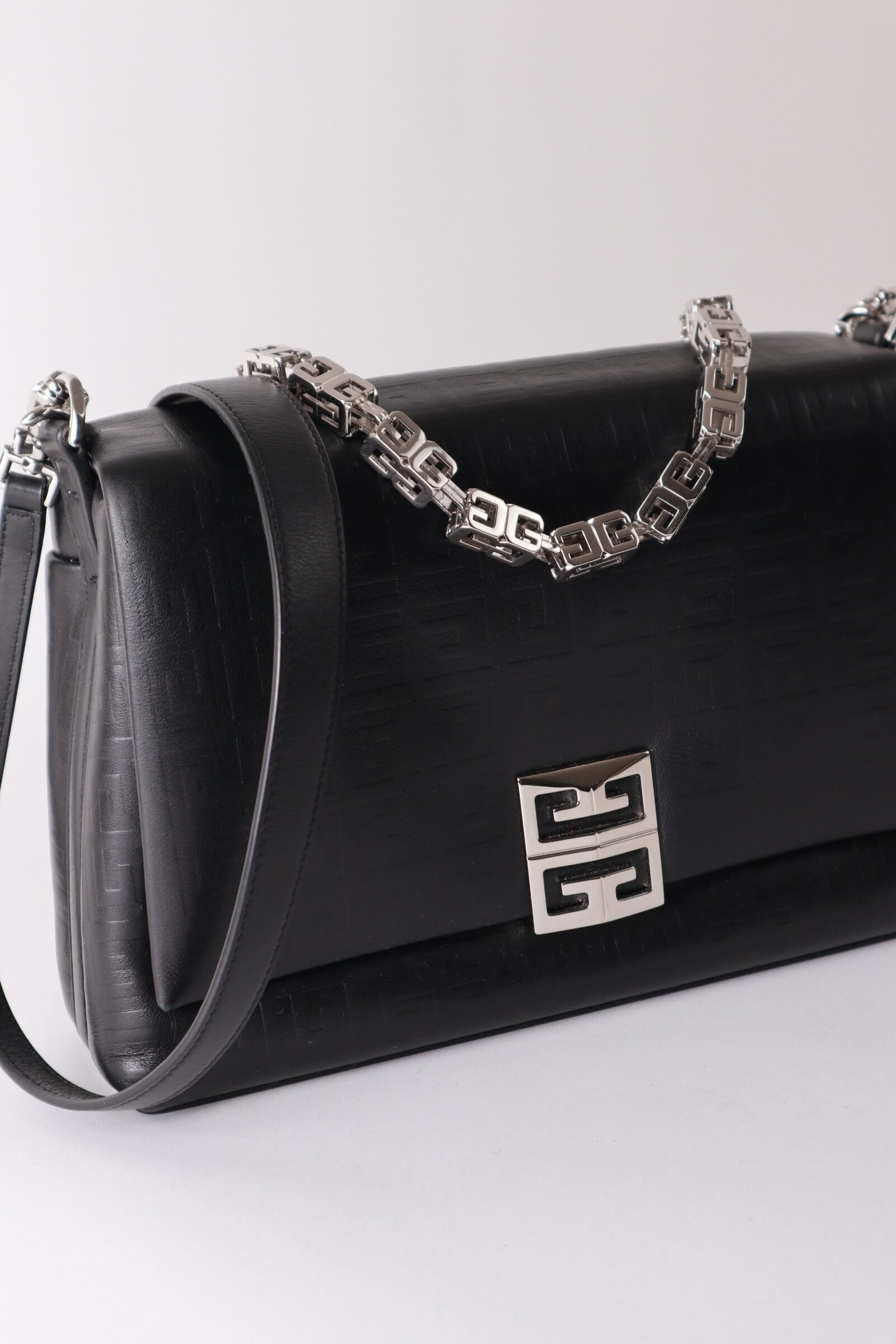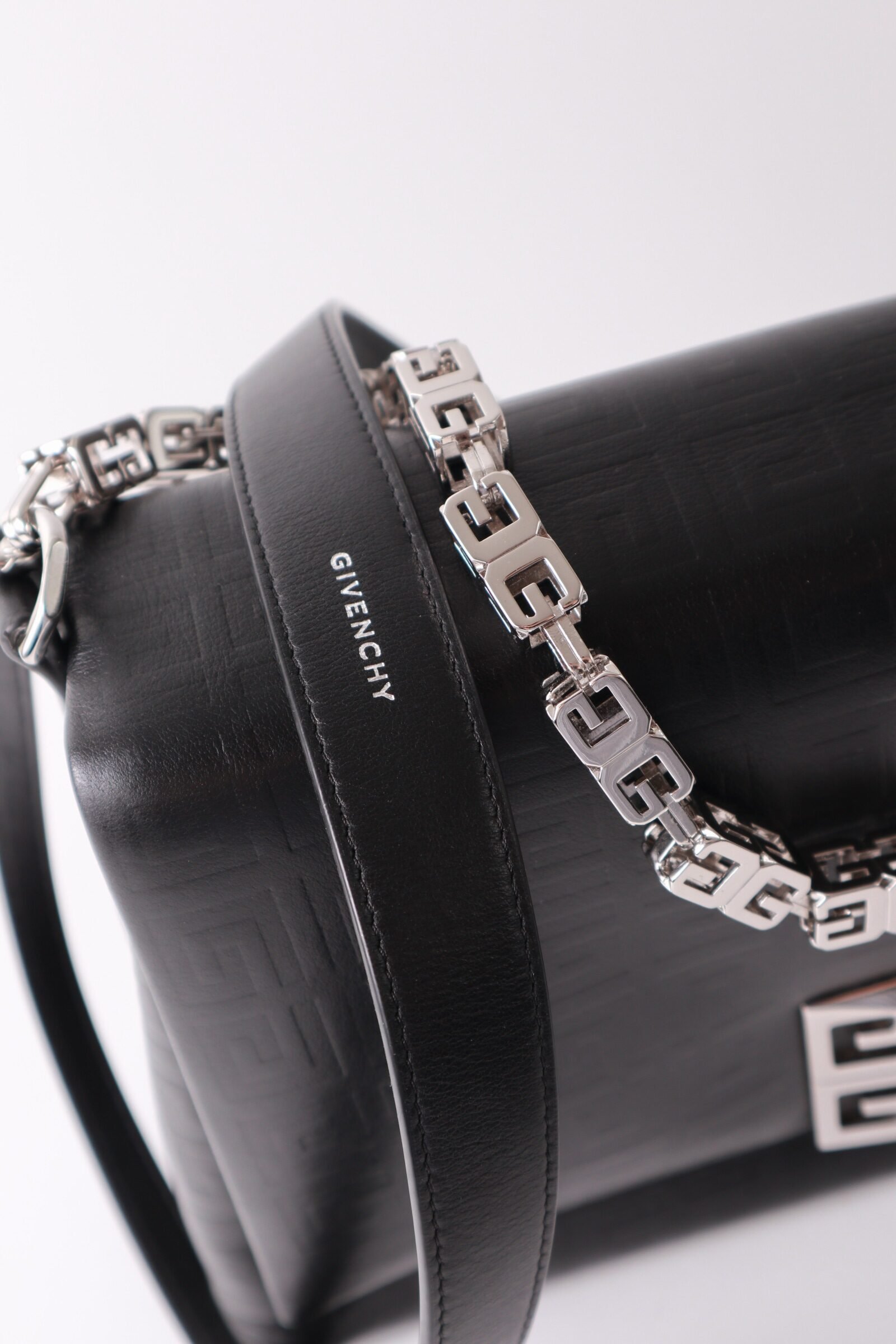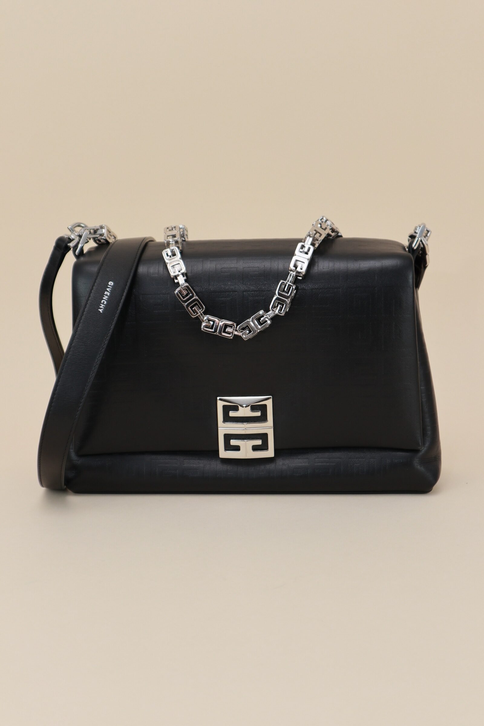 A modern icon of structured elegance, this Givenchy 4G Chain Shoulder Bag exudes sophistication through every detail. Crafted in luxurious black leather with an embossed tonal monogram finish, this statement piece is defined by its striking silver-tone 4G hardware and bold, architectural chain.