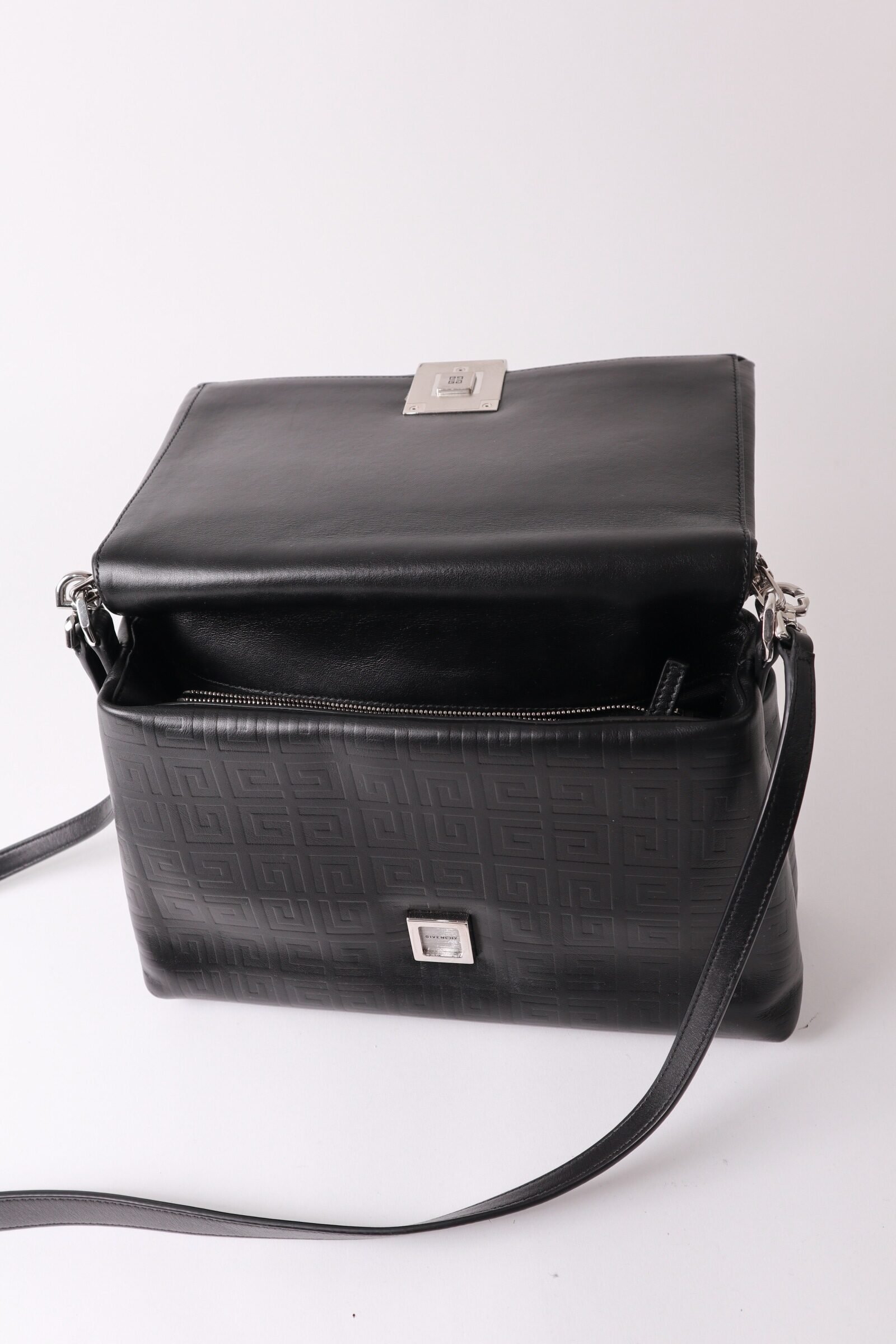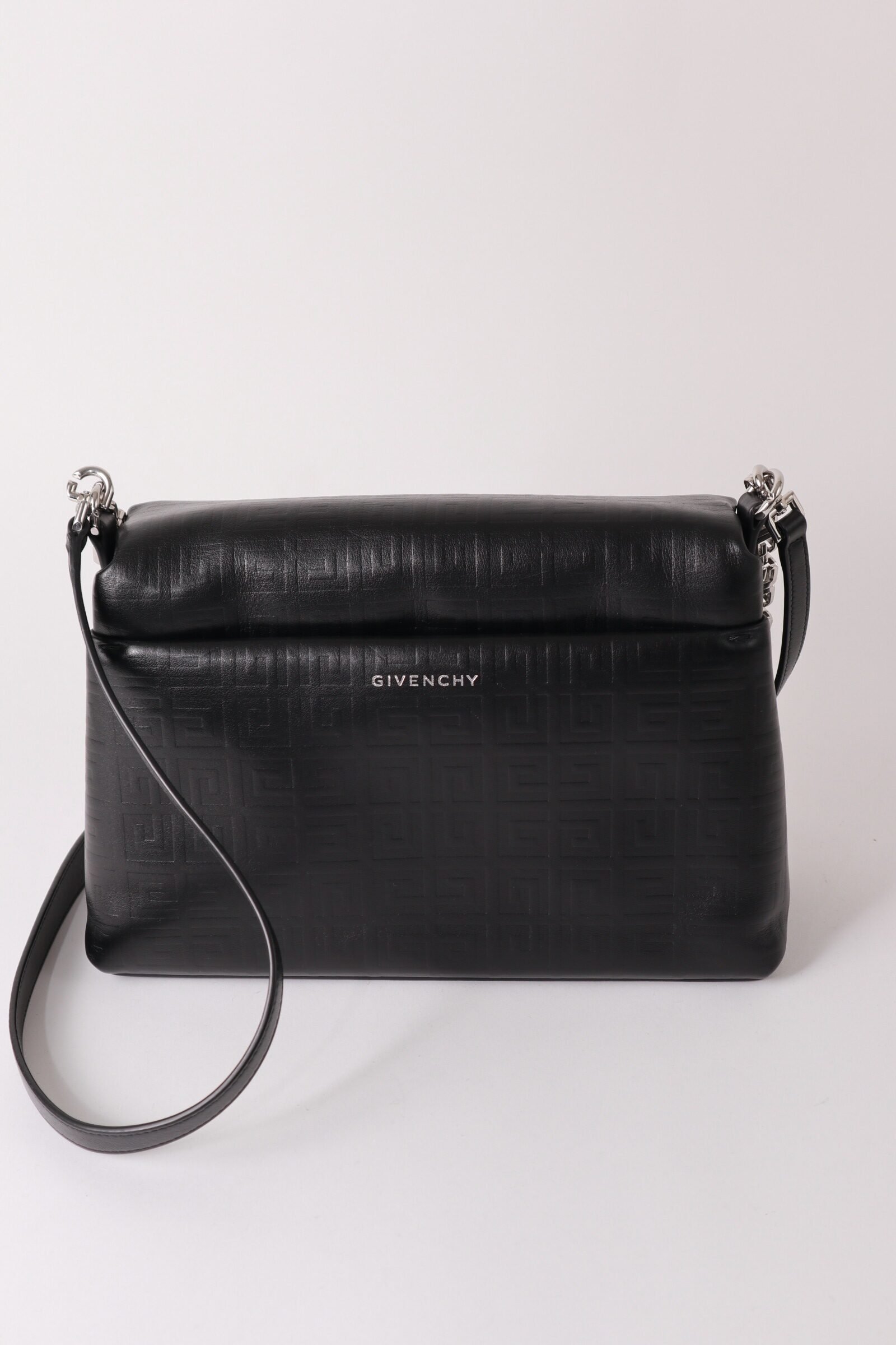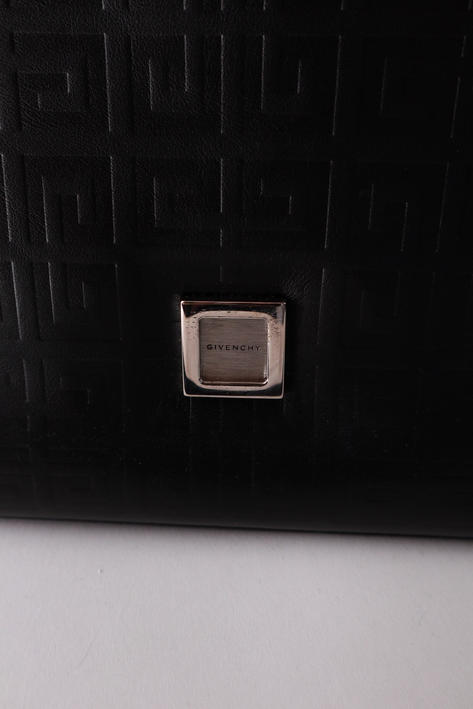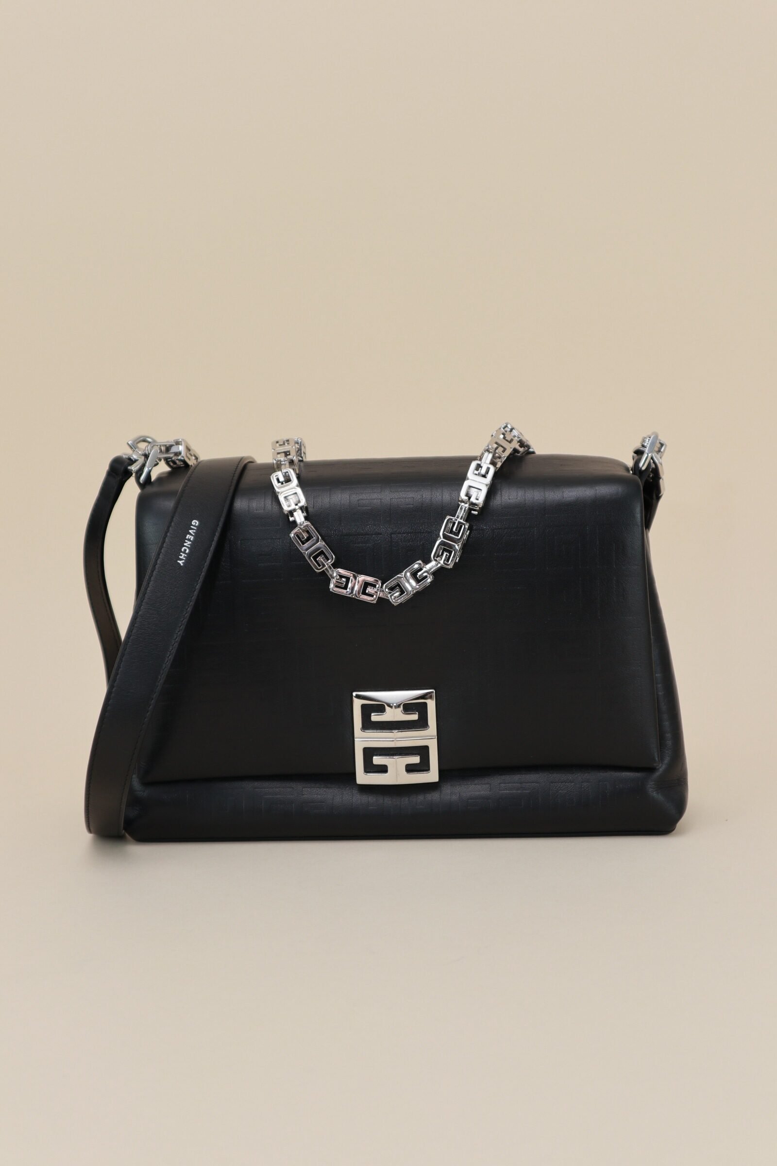 A modern icon of structured elegance, this Givenchy 4G Chain Shoulder Bag exudes sophistication through every detail. Crafted in luxurious black leather with an embossed tonal monogram finish, this statement piece is defined by its striking silver-tone 4G hardware and bold, architectural chain.