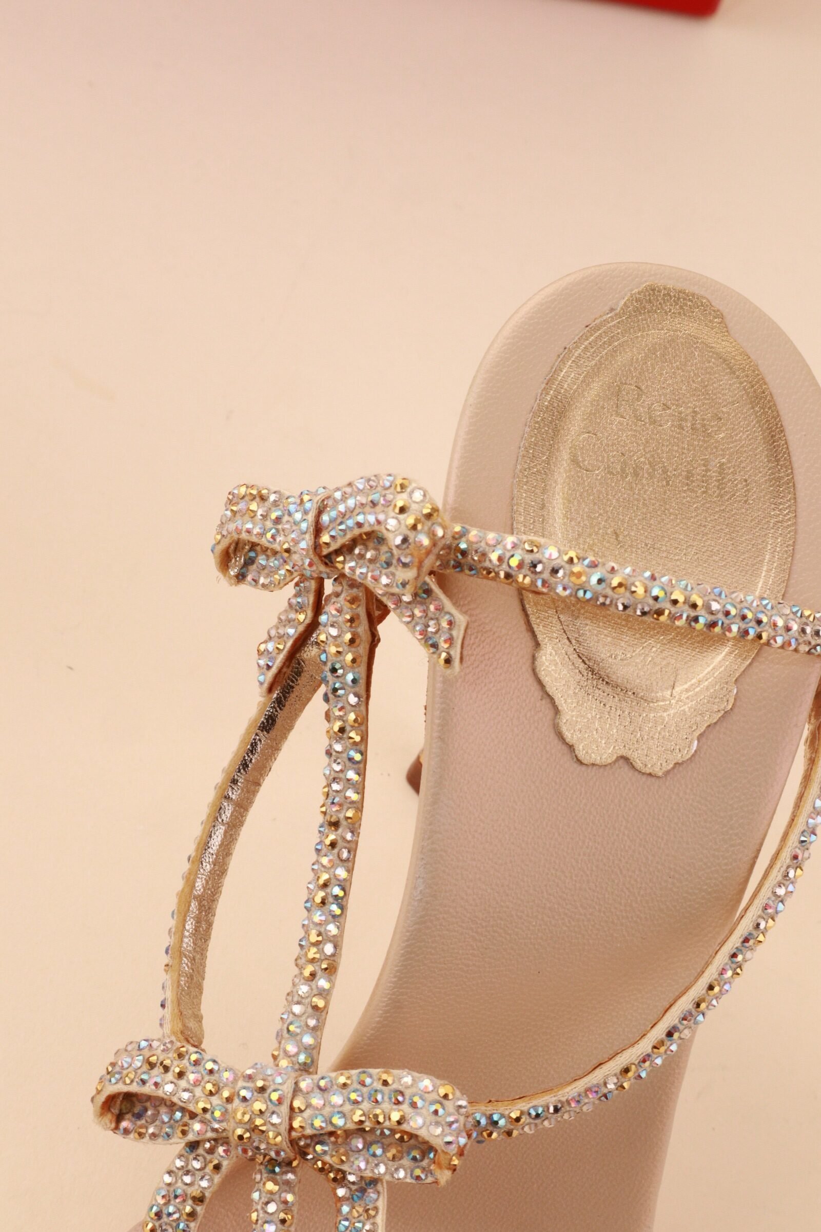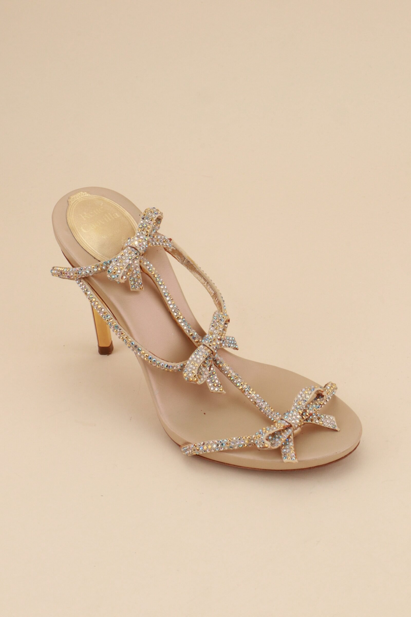 Elegant René Caovilla Catherina heels, featuring delicate crystal-embellished straps with feminine bow details. A refined and glamorous design that reflects the house’s iconic craftsmanship and eveningwear elegance.