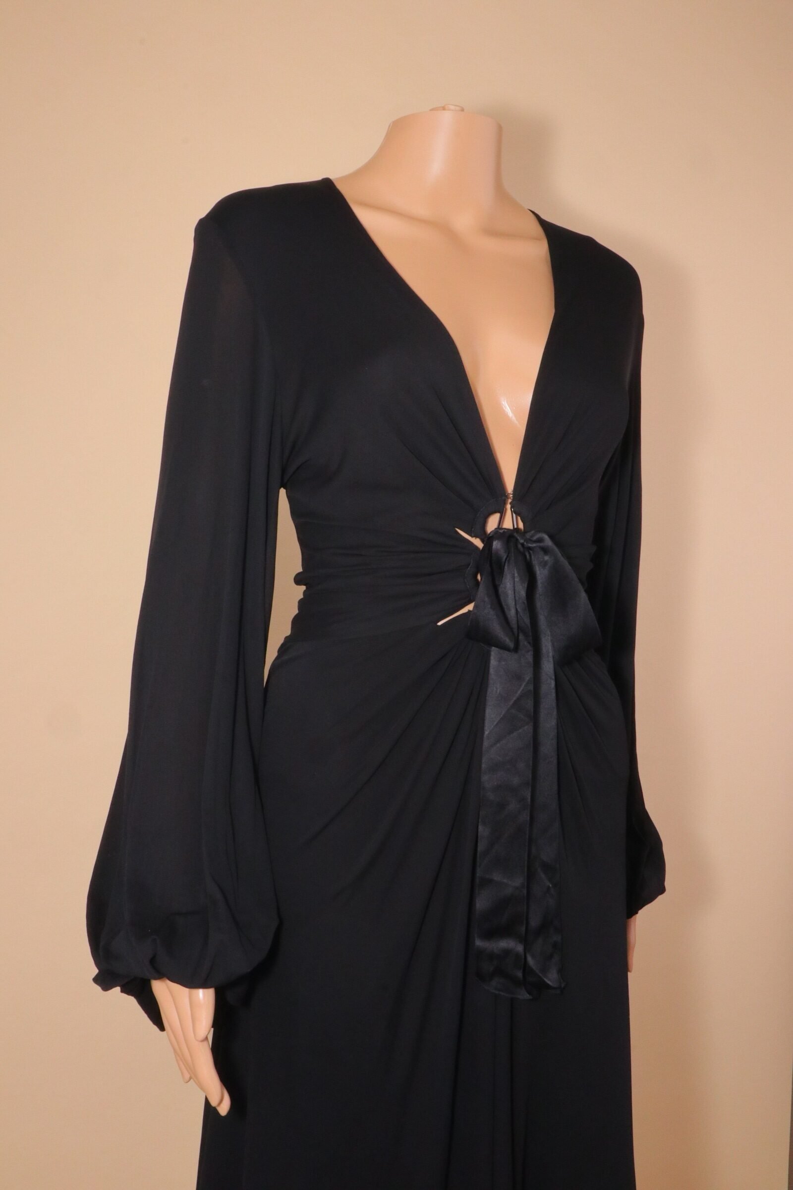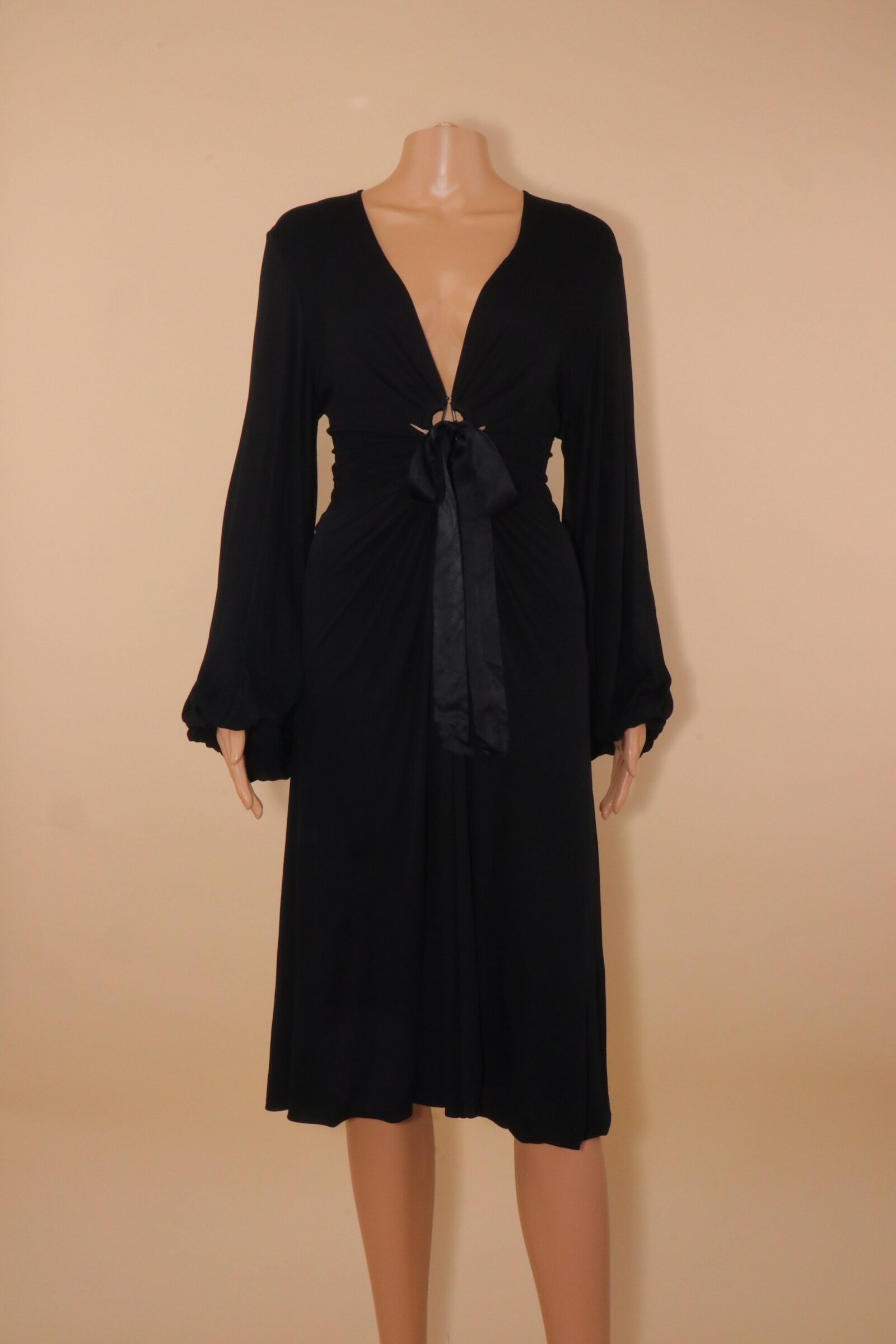This elegant black dress features a deep neckline with a delicate tie-front detail, creating a flattering gathered effect through the waist. Crafted in lightweight cupro, it offers a silky, luxurious feel with a natural flow, while the voluminous sleeves add a touch of drama and sophistication. A timeless yet subtly statement piece, perfect for both evening wear and elevated everyday styling.