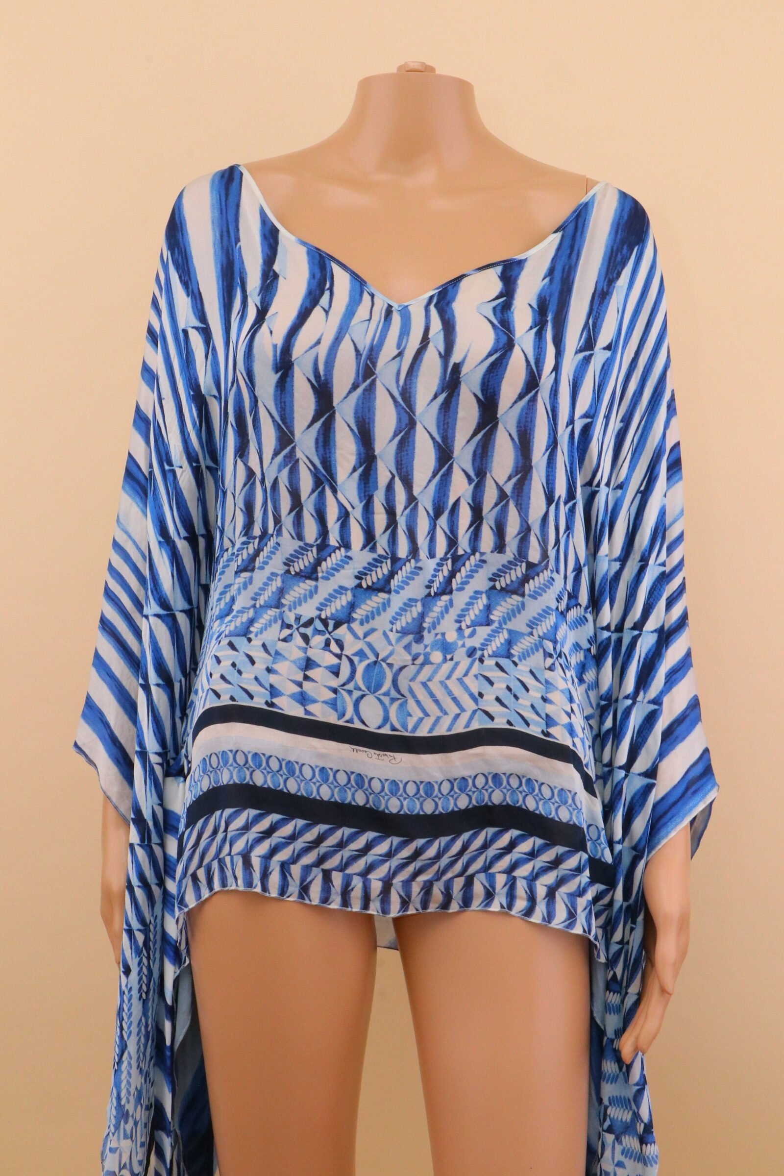 Crafted in lightweight silk, the blouse drapes beautifully over the body, enhanced by its wide, flowing sleeves and relaxed silhouette. The striking blue-toned print creates movement and depth, while the optional belt allows you to cinch the waist for a more defined, sculpted look. Worn loose or styled with the belt, it transforms from effortless resort elegance to a more seductive, statement silhouette.